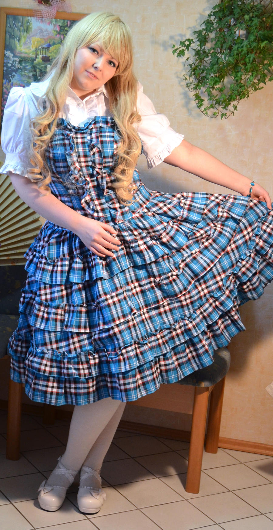 | R06 | “Country Lolita - blue dress” | https://www.deviantart.com/renaigirls/art/Country-Lolita-blue-dress-284742426 |  | Seated lean, skirt spread | Gothic/country lolita (tiered ruffles, plaid) | #2B5E8F #F7F7F7 #A22A2A #1C1C1C | Indoor warm ambient, soft shadows | © artist; check page license | |